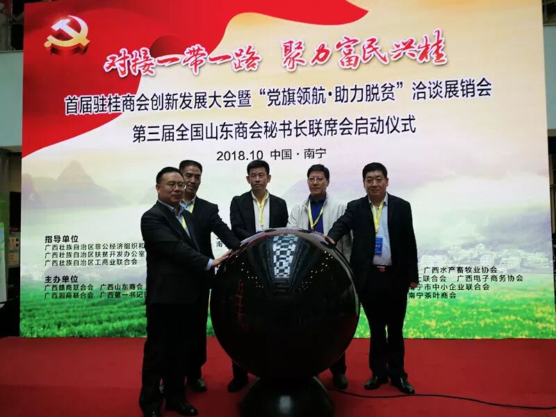 10月19日上午,全国省级山东商会的秘书长在南宁华南城与5家东盟国家的领事进行了座谈,并参加了以“对接一带一路聚力富民兴桂”为主题的首届驻桂商会创新发展大会暨“党旗领航·助力脱贫”洽谈展销会开幕式。